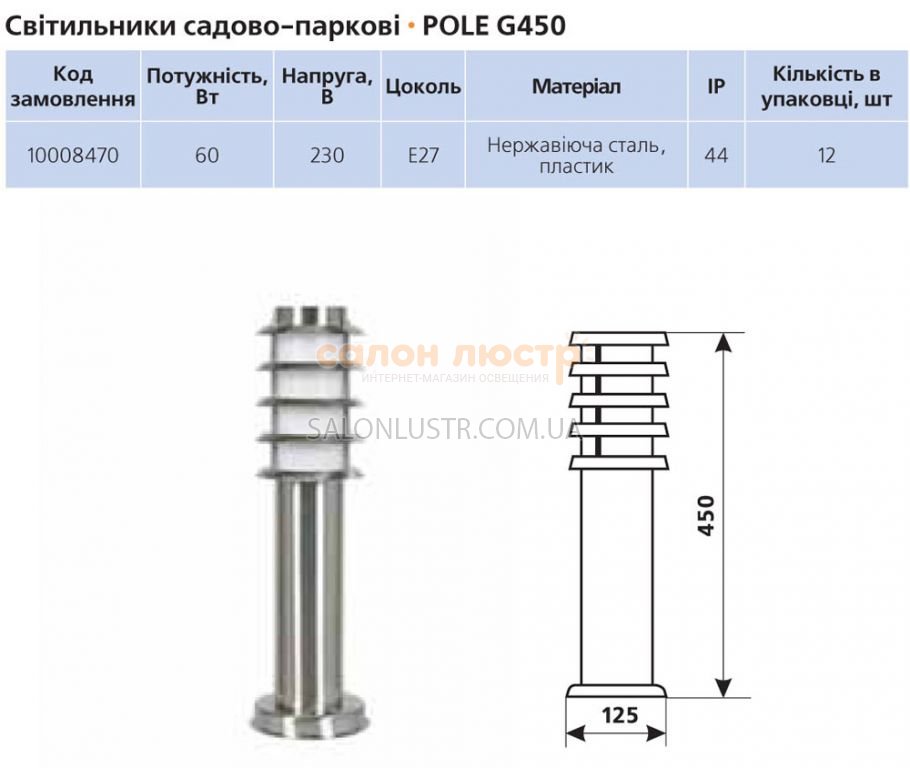 Высота: 45 см; ширина: 12,5 см; лампы: 1 х Е27 230V 60W;