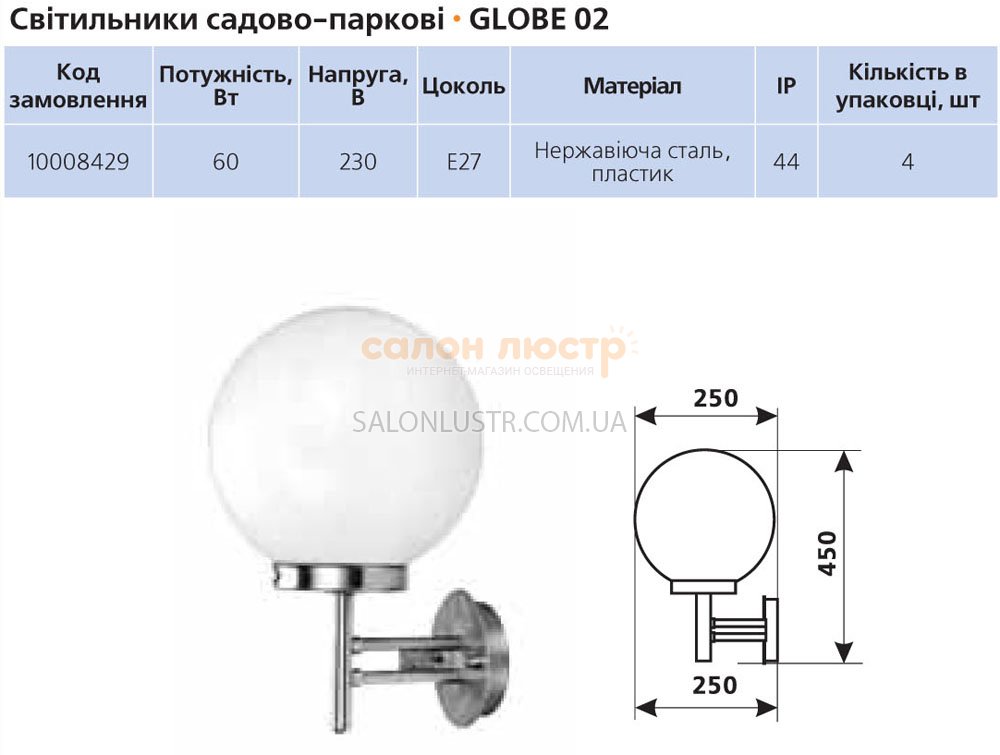 Высота: 45 см; ширина: 25 см; лампы: 1 х Е27 230V 60W;Степень защиты от воды и пыли: IP 44;