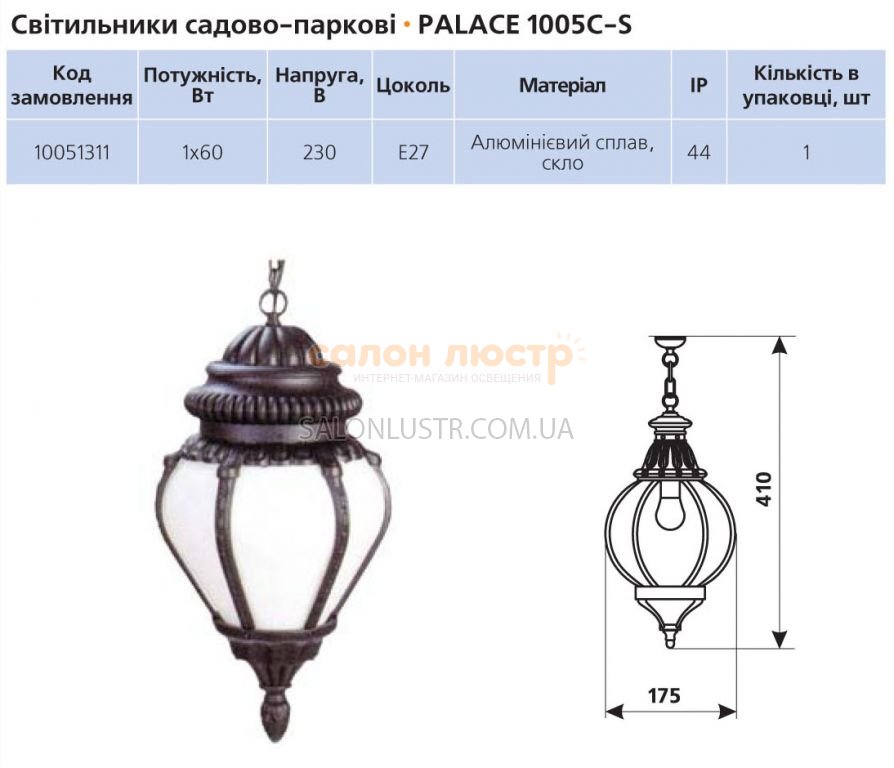 Высота: 41 см; ширина: 17.5 см; лампы: 1 х Е27 230V 60W;
