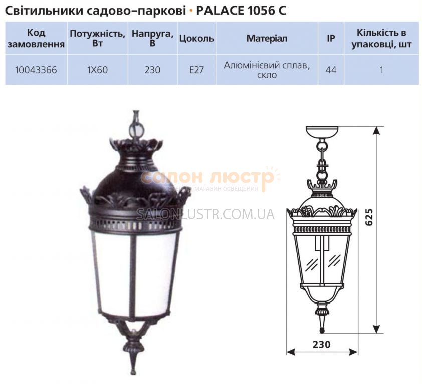 Высота: 62.5 см; ширина: 23 см; лампы: 1 х Е27 230V 60W;