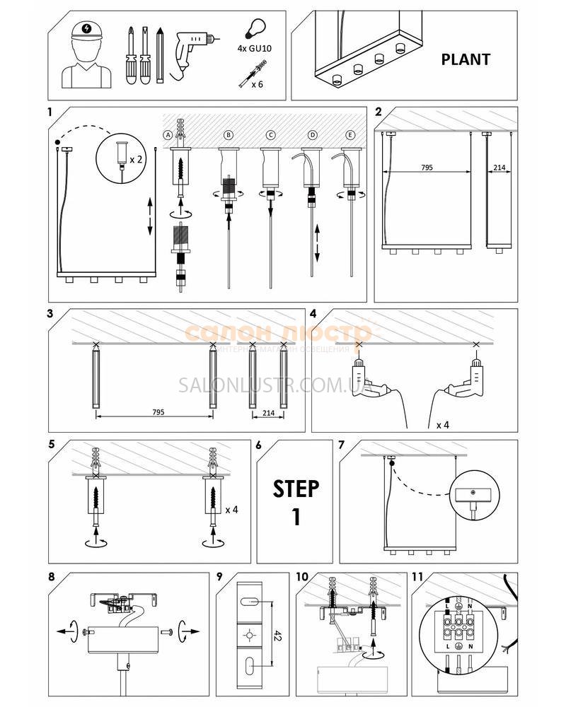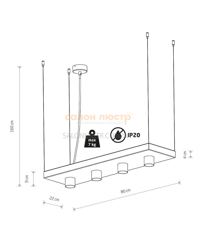 Высота: 50-120 см; ширина: 80х22 см; лампы: 4 х GU10 х 35 Вт.