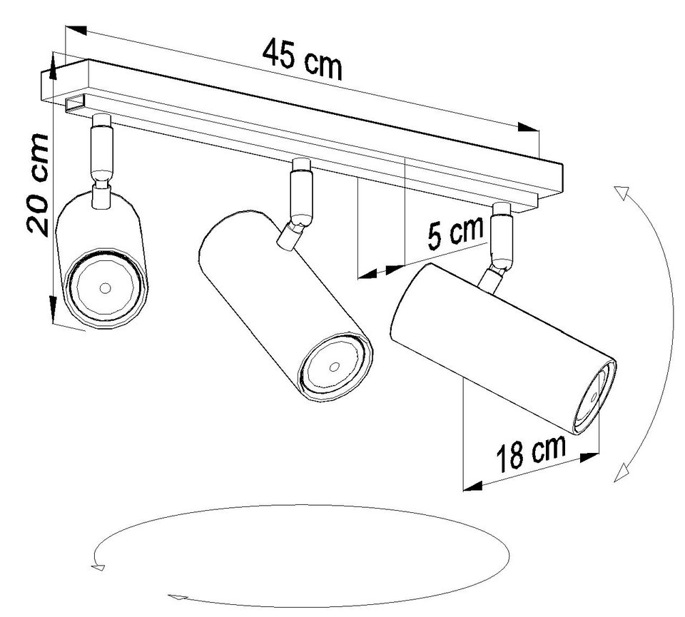 Высота: 20 см; ширина: 45 см; лампа: 3 х GU10 х 40 Вт;