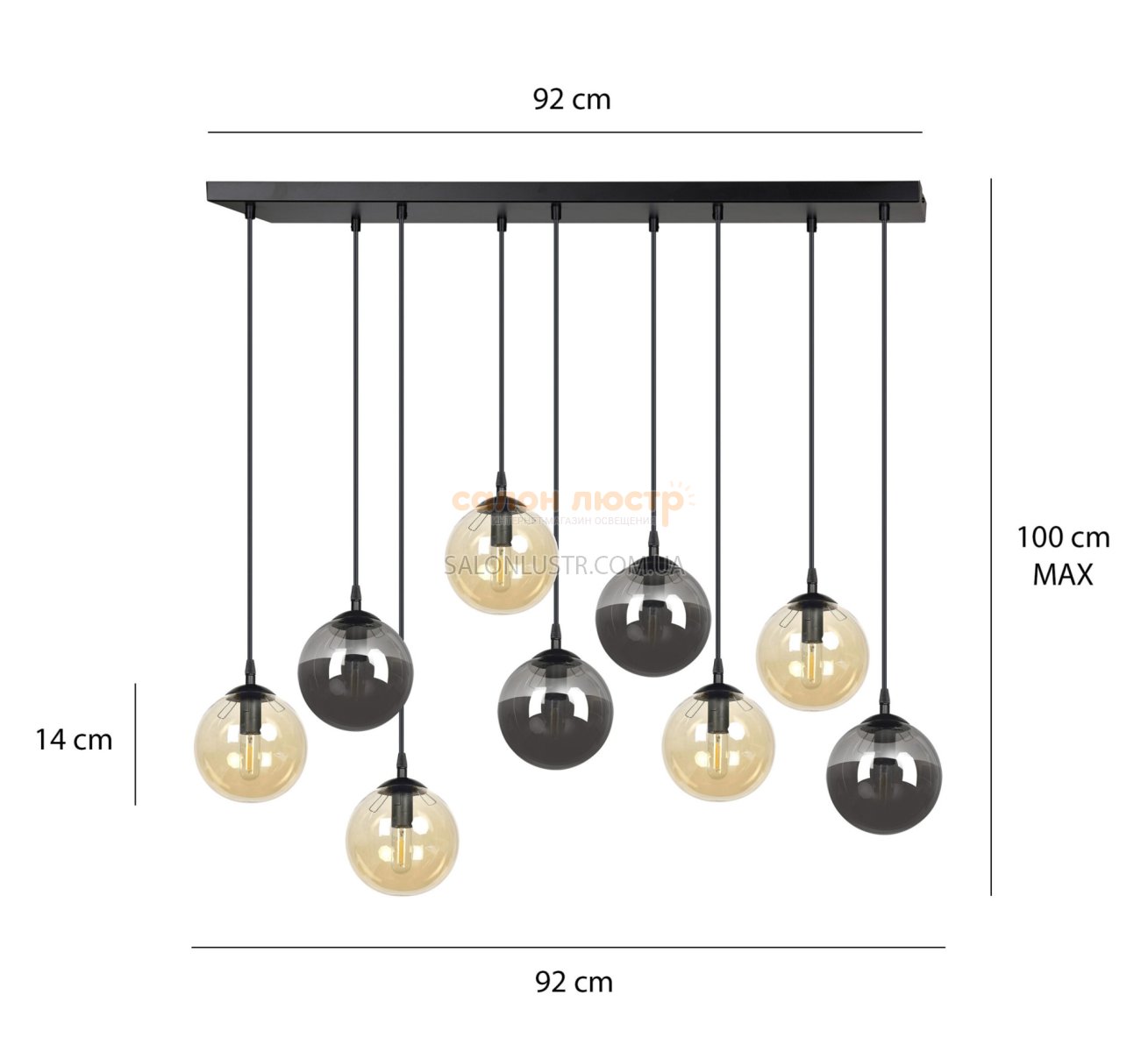 Высота: 40-120 см; ширина: 92 см; лампы: 9 х Е-14 х 60 Вт.