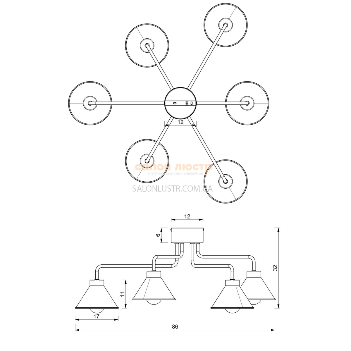 Высота: 32 см; ширина: 86 см; лампа: 6 х Е-27 х 60 Вт.