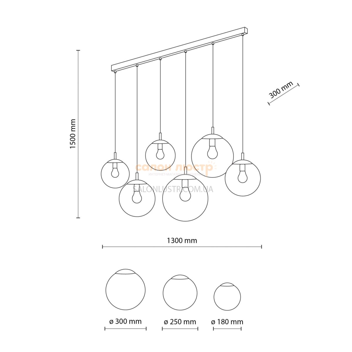 Высота: 50-150 см; ширина: 130х30 см; лампы: 6 х Е27 х 15 Вт LED;