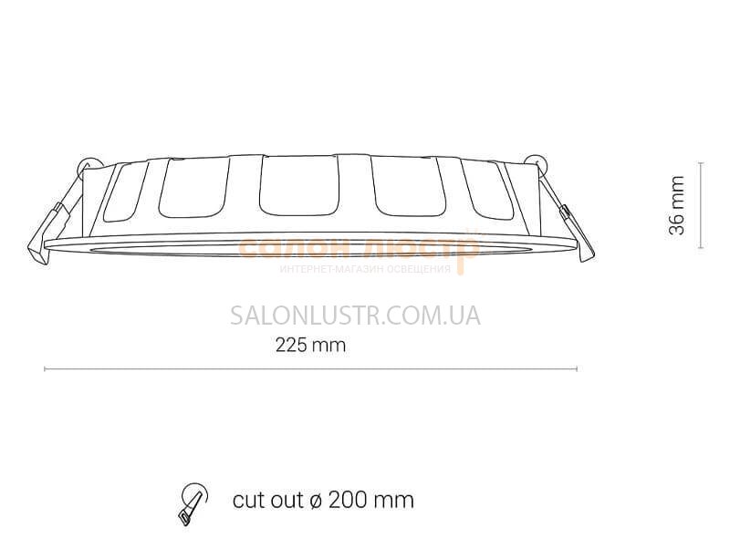 Высота: 3,6 см; диаметр: 22,5 см; лампы: LED х 24 Вт(3000K, 2200Lm).