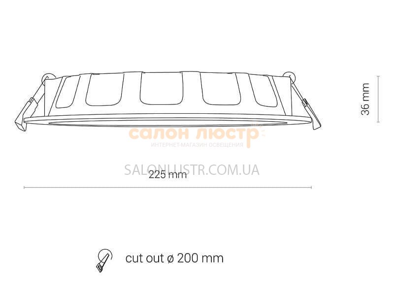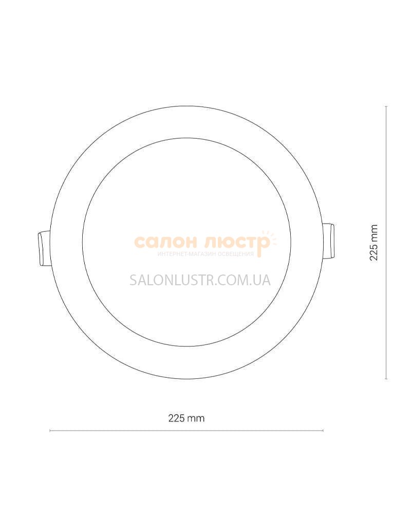Высота: 3,6 см; диаметр: 22,5 см; лампы: LED х 24 Вт(4000K, 2200Lm).