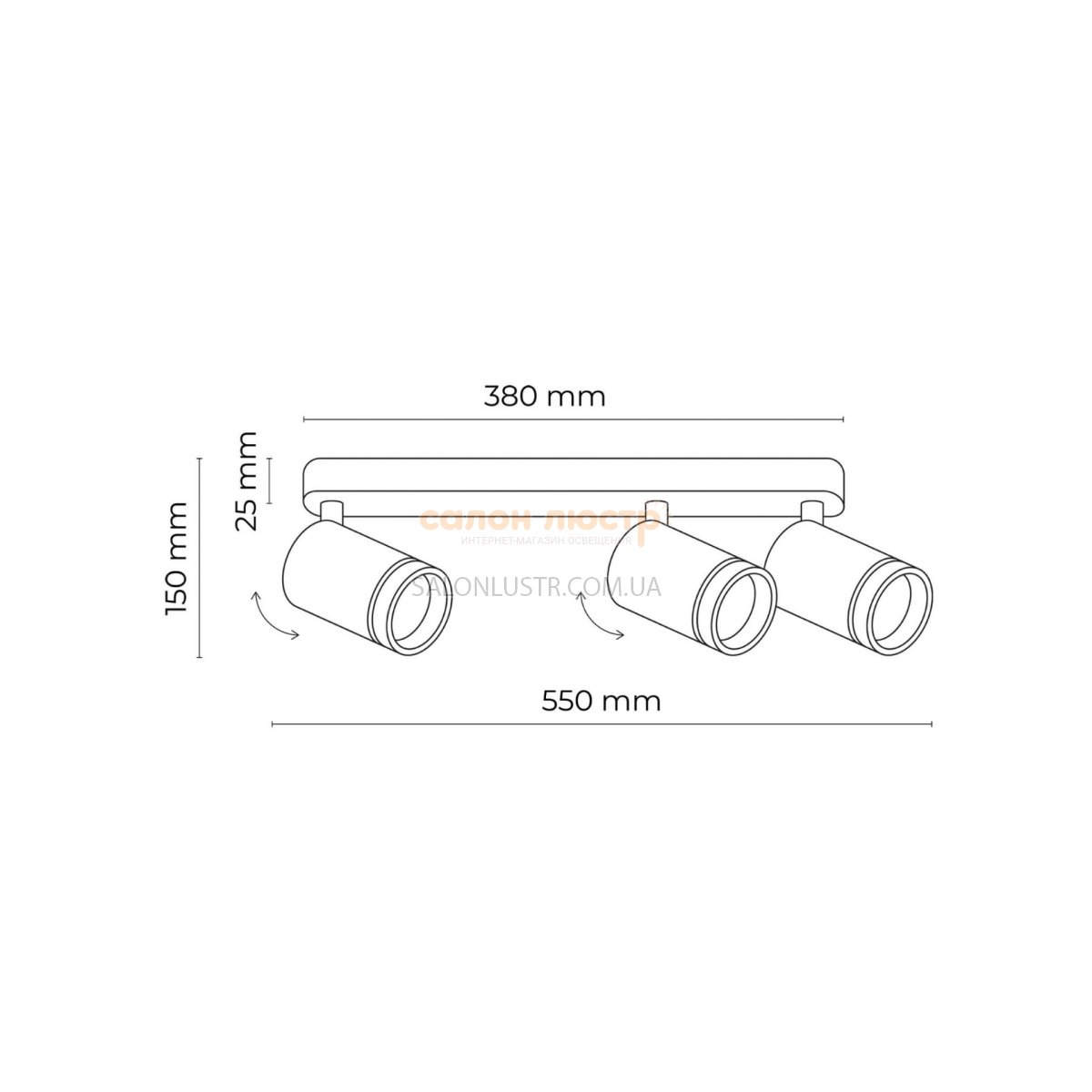 Высота: 15 см; длина: 55 см; лампа: 3 х GU10 х 10 Вт.