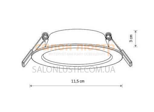 Высота: 3 см; диаметр: 11,5 см; лампы: LED х 6 Вт(3000K, 360Lm).