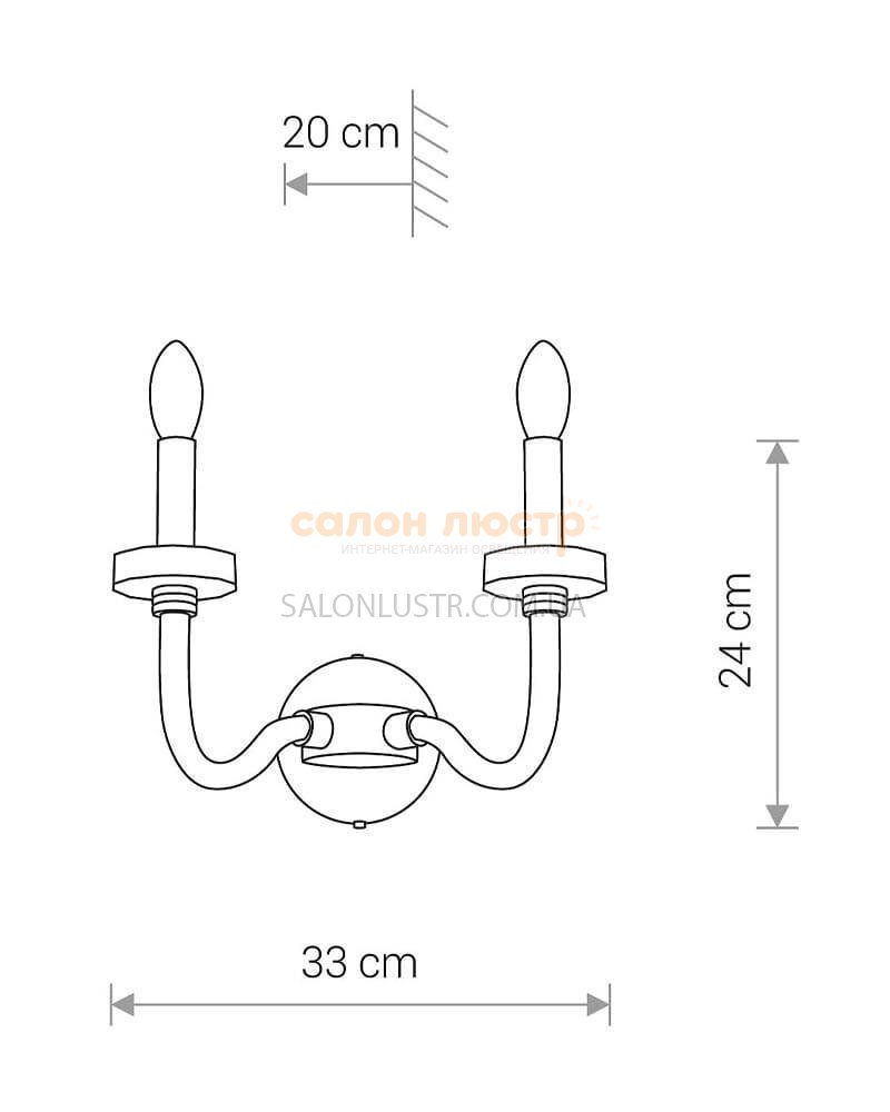 Высота: 24 см; ширина: 33 см; лампы: 2 х Е-14 х 60 Вт.