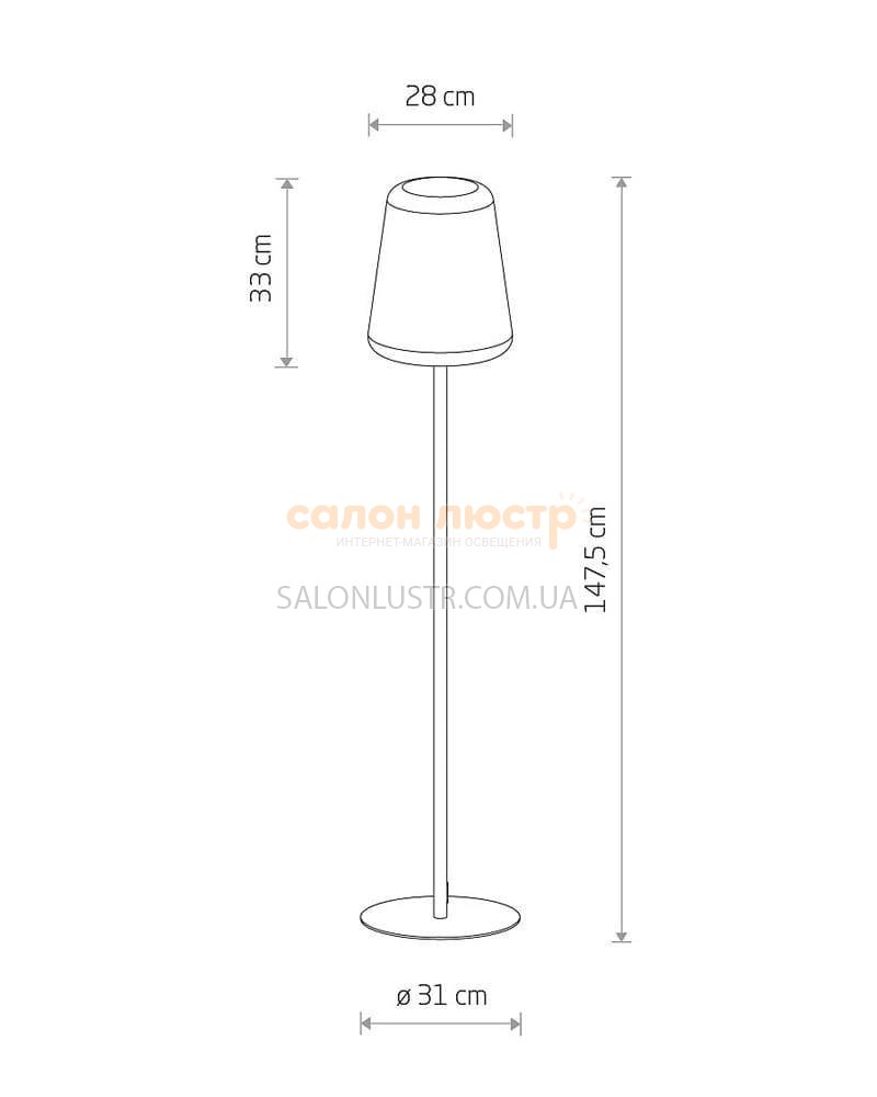 Высота: 148 см; ширина: 31 см; лампы: 1 х Е27 х 60 Вт.