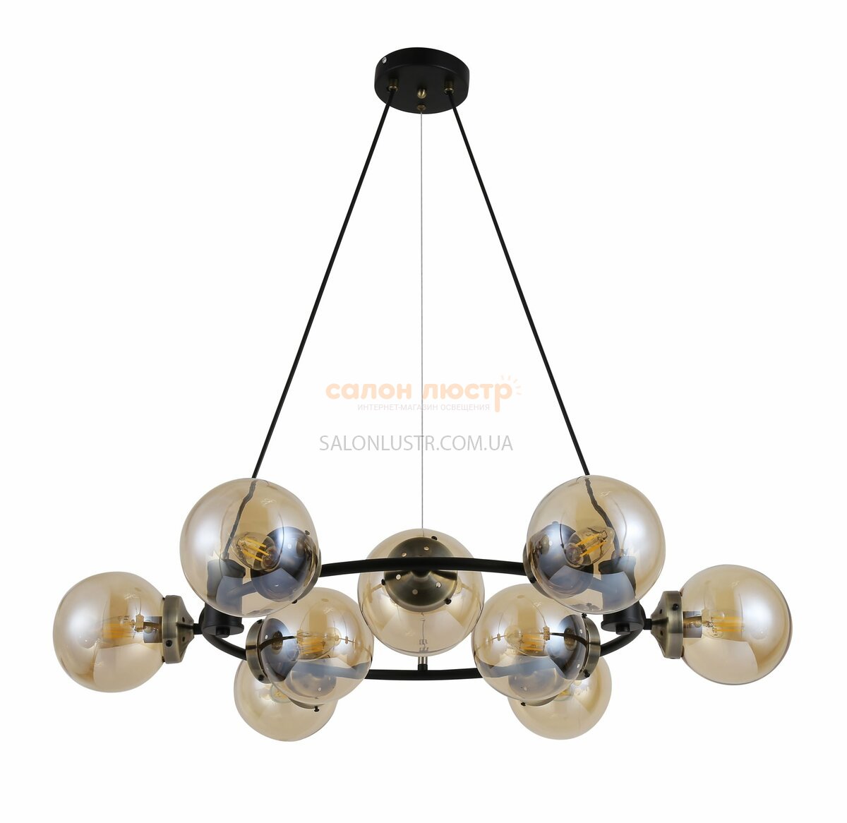 Высота: 50-75 см; диаметр: 80 см; лампы: 9 х Е14 х 60 Вт.