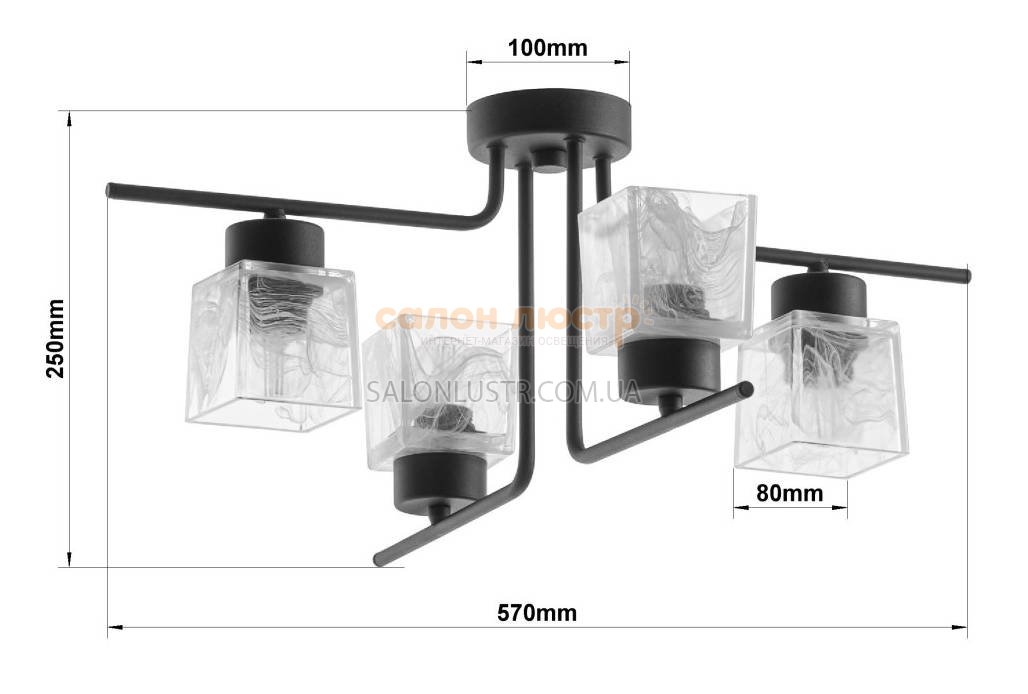 Высота: 25 см; ширина: 57 см; лампы: 4 х Е-27 х 60 Вт.