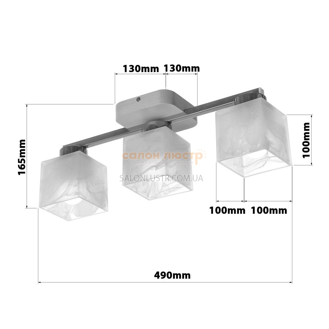 Высота: 16,5 см; ширина: 49 см; лампы: 3 х Е-27 х 60 Вт.
