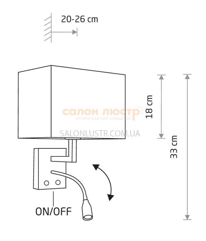 Высота: 33 см; ширина: 26 см; отступ: 20 см; лампы: 1 х Е27 х 60 Вт + 2,2 Вт LED 4000К.