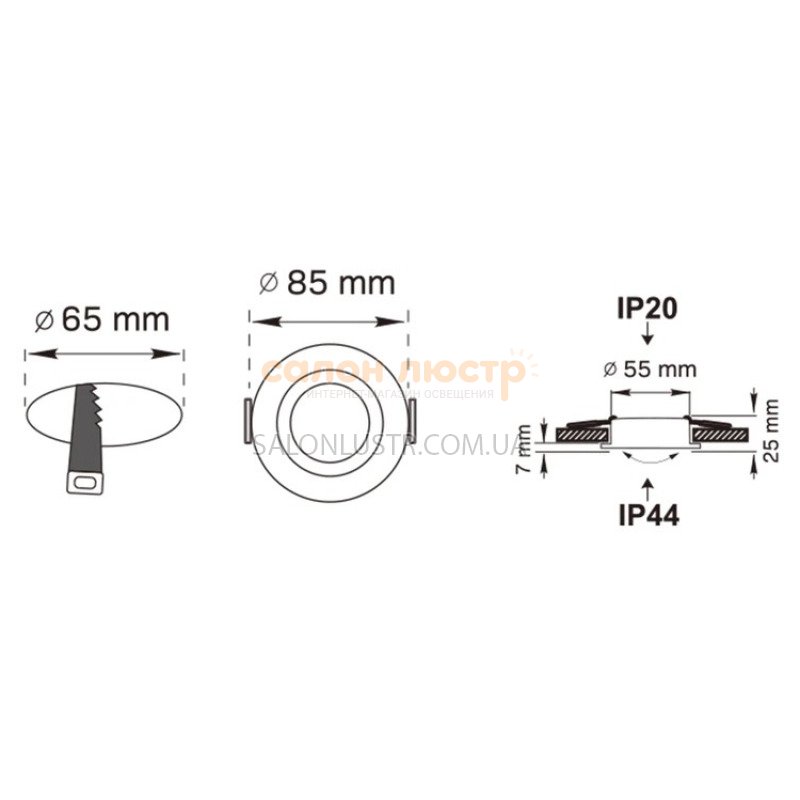 Высота: 2,5 см; диаметр: 8,5 см; лампы: 1 х GU10 х 50 Вт; IP44.