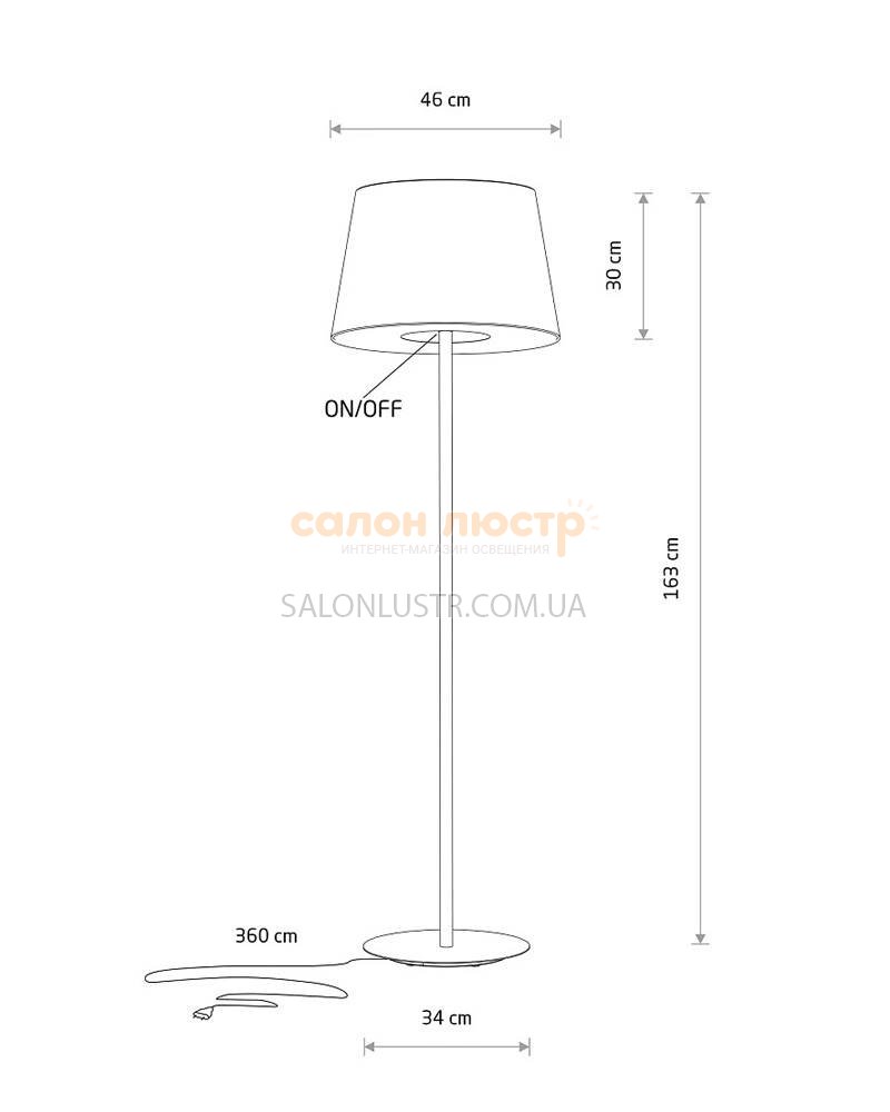 Высота: 163 см; ширина: 46 см; лампы: 1 х Е27 х 10 Вт LED.