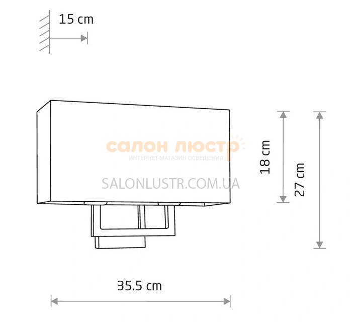 Высота: 27 см; ширина: 35,5 см; отступ: 15 см; лампы: 2 х Е27 х 60 Вт.