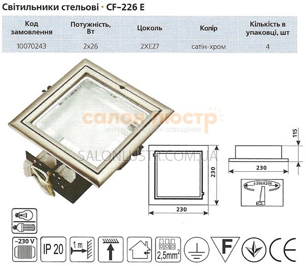 Высота: 115мм; диаметр: 230 x 230мм; лампа: 2 х 26Вт E27(в светильнике можно использовать как энергосберегающую лампу, так и светодиодную лампу различной мощности.)