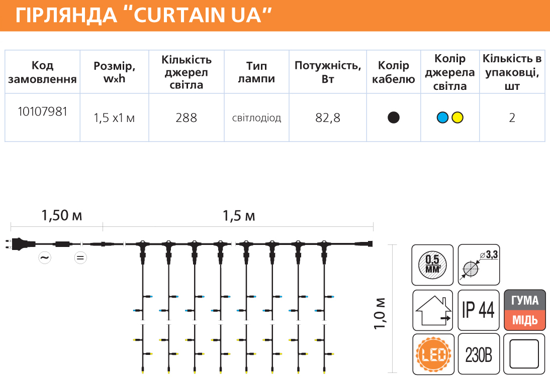 Длина: 1,5 метра; высота: 1 метр; Цвет светодиодов: синий+желтый; цвет кабеля: черный; Количество светодиодов: 288 шт. Напряжение: 230 В; Класс защиты: IP44; Диаметр кабеля: 3,3 мм; Сечение кабеля: 0,5 кв. мм; Материал кабеля: резина/медь.