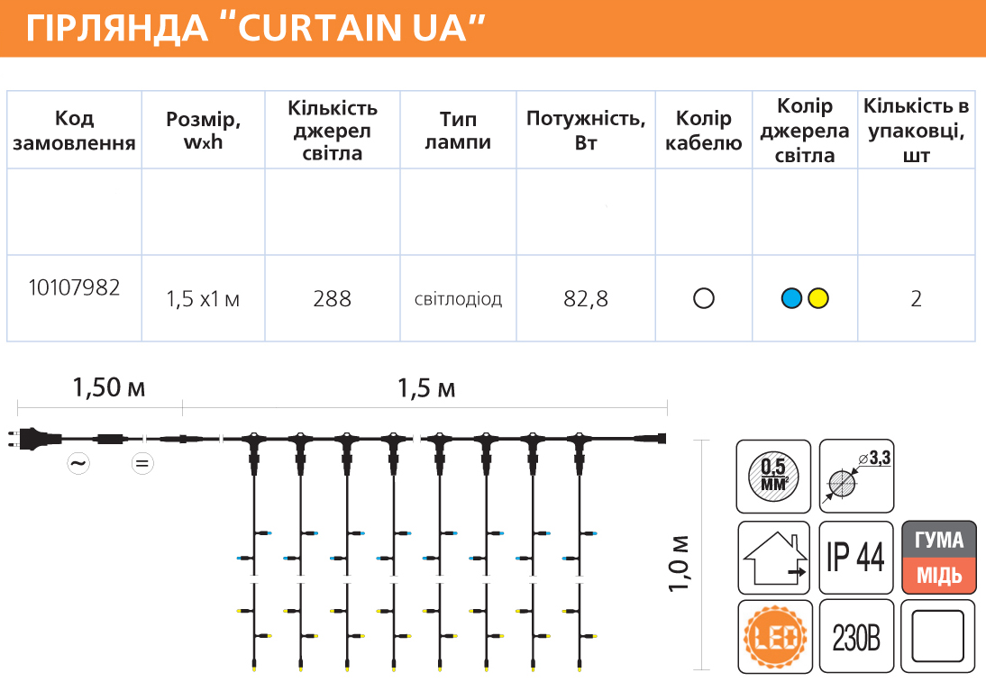 Длина: 1,5 метра; высота: 1 метр; Цвет светодиодов: синий+желтый; цвет кабеля: белый; Количество светодиодов: 288 шт. Напряжение: 230 В; Класс защиты: IP44; Диаметр кабеля: 3,3 мм; Сечение кабеля: 0,5 кв. мм; Материал кабеля: резина/медь.