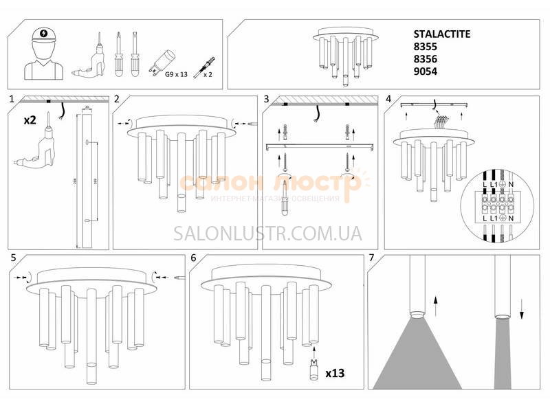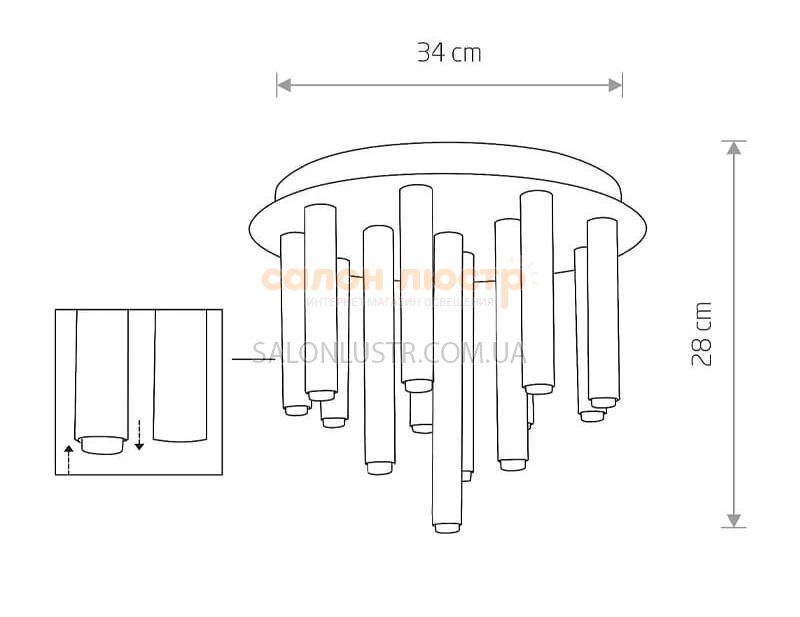 Высота: 28 см; ширина: 34 см; лампы: 13 х G9 х 10 Вт LED.