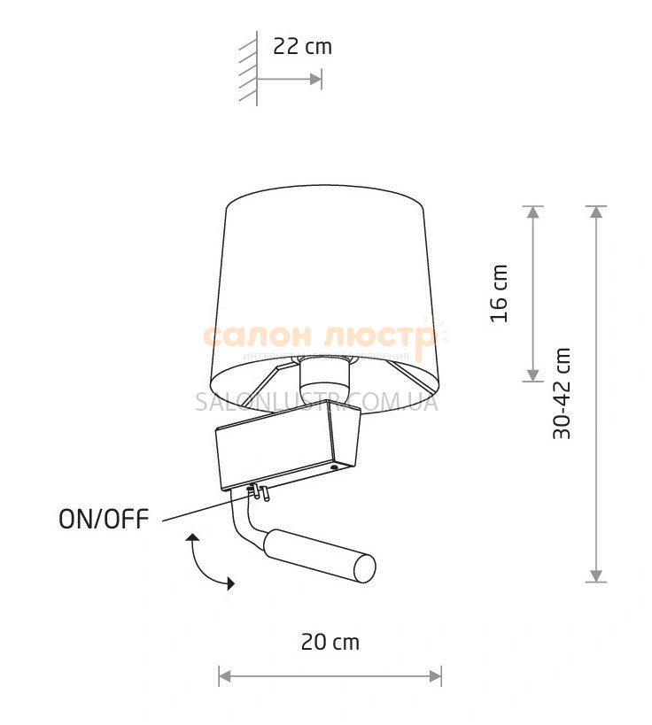 Высота: 25 см; ширина: 20 см; отступ: 22 см; лампы: 1 х Е14 х 60 Вт.