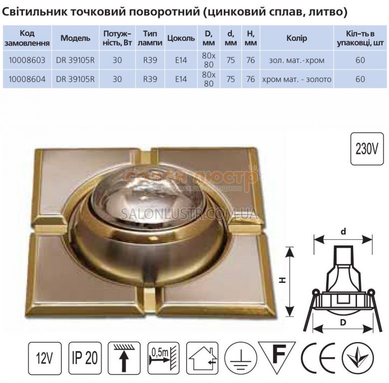 Высота: 7,6 см; диаметр: 8 см; лампы: 1рефлекторная лампа R39,цоколь Е14;напряжение:230В;мощность: 30Вт.