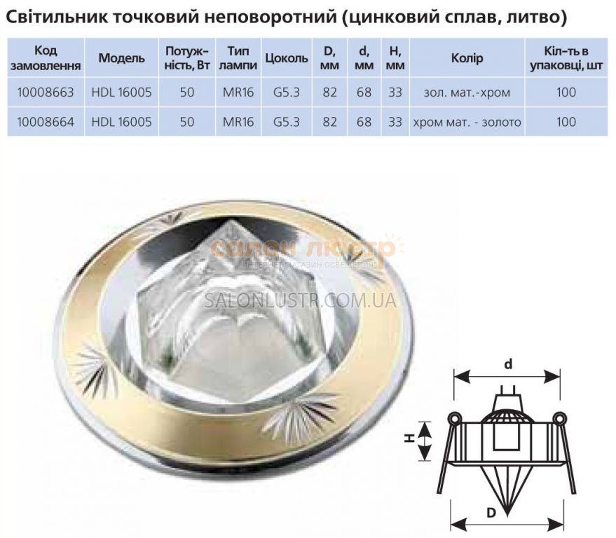 Высота: 3,3 см; диаметр: 8,2 см; лампы: 1галогенная лампа MR16,цоколь G5,3;напряжение: 12В/230В;мощность: 50Вт,35Вт,20Вт.