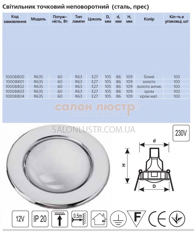 Крапковий світильник не поворотний виробництва компанії DELUX. Матеріал: метал(сталь,прес). Колір: білий,золото, античне золото, матовий хром,хром. Висота: 10.9 см; діаметр: 10.5 см; лампи: 1рефлекторна лампа R63,цоколь Е27;напруга:230В;потужність: 60Вт,40Вт. Також, можливо використовувати енергозберігаючі лампочки EXR 63 11Вт, приблизно рівної потужності 55Вт лампи розжарювання.