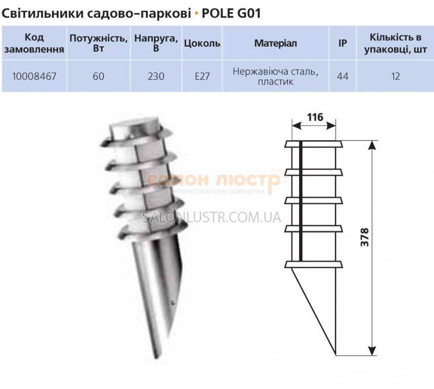 Висота: 37.8 см; ширина: 11.6 см; лампи: 1 х Е27 230V 60W;