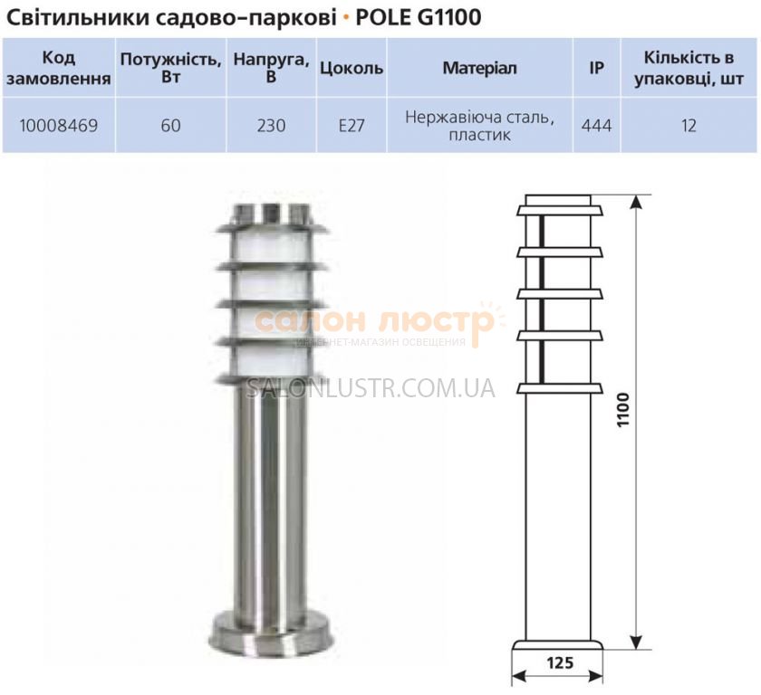 Висота: 110 см; ширина: 12,5 см; лампи: 1 х Е27 230V 60W;
