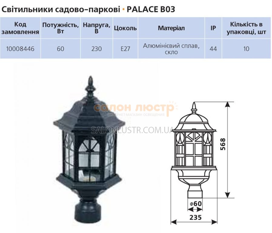 У світильнику садово-парковому Delux Palace B03 для зовнішнього висвітлення можливо використовувати: лампу накалювання, енергозберігаючу лампу, LED лампу.