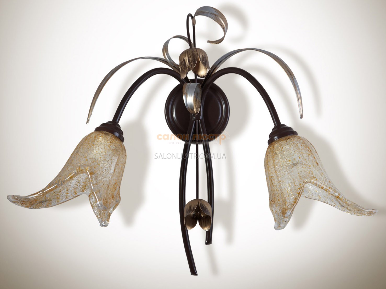 Світильник настінний (бра) серії Тюльпано виконаний у стилі флористика виробництва компанії "N&B Light"; Матеріал: фарбований метал (ручний розпис), стекло; Колір (підстави): Коричневий матовий - золото; Плафон: Венера нова; Колір (плафонів): Бежевий; Висота: 22 см; ширина: 40 см; лампи: 2 х Е-14 х 60 Вт.