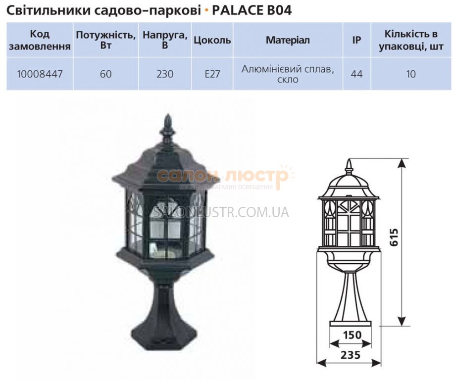 У світильнику садово-парковому Delux Palace B04 для зовнішнього висвітлення можливо використовувати: лампу розжарювання, енергозберігаючу лампу, LED лампу.