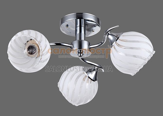 Люстра стельова виробництва компанії Sirius; Матеріал: метал, скло; Колір підстави: хром; Колір плафона: білий матовий+прозорий; Висота: 20 см; діаметр: 40 см; лампи: 3 х Е27 х 60 Вт.