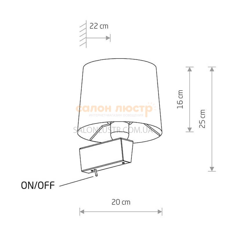 Висота: 25 см; ширина: 20 см; відступ: 22 см; лампи: 1 х Е14 х 60 Вт.