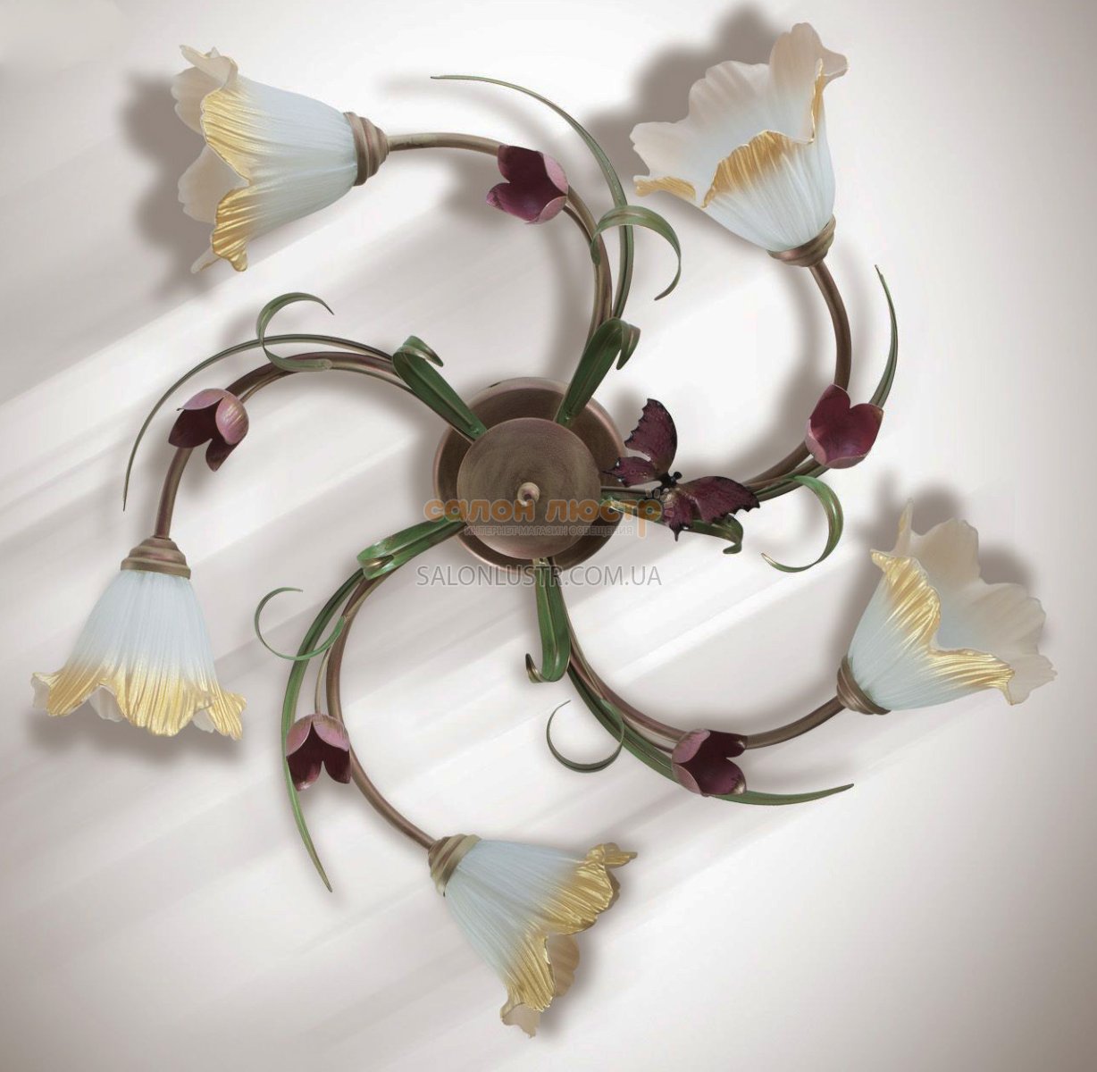 Люстра флористика виробництва компанії Україна; Матеріал: фарбований метал (ручний розпис), скло; Колір основи: Очерет; Плафон: Каліфорнія; Колір плафонів: Перли; Висота: 28 см; ширина: 68 см; лампи: 5 х Е-14 х 60 Вт.