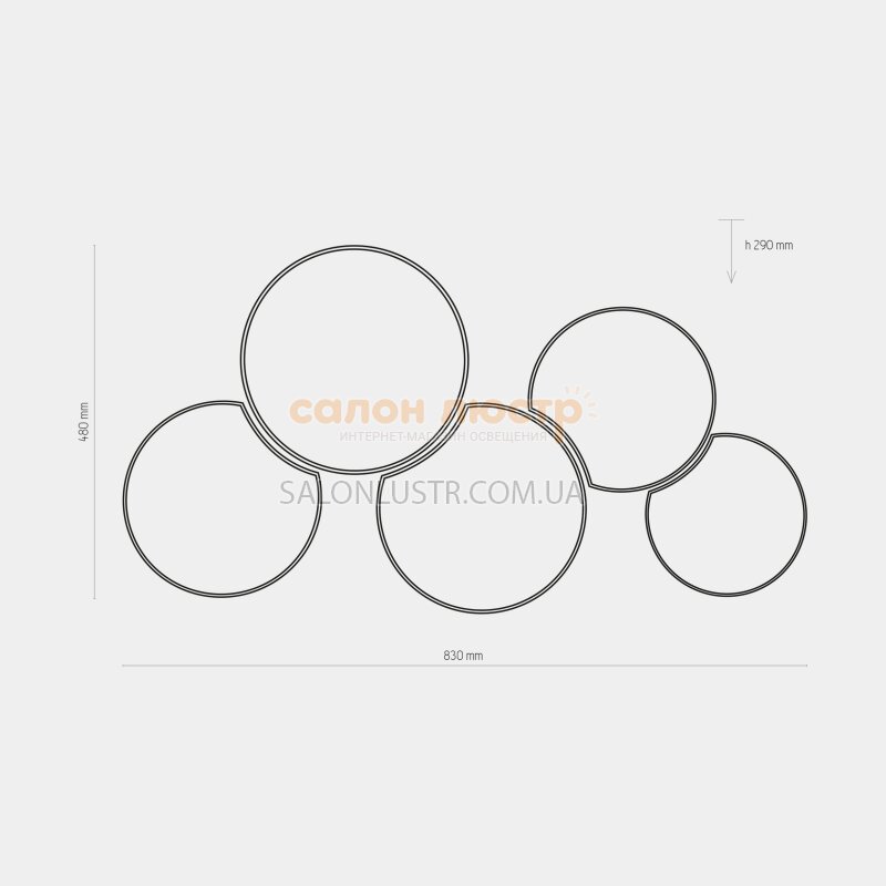 Висота: 29 см; діаметр: 48 х 83 см; лампи: 5 х Е-27 х 15 Вт LED.