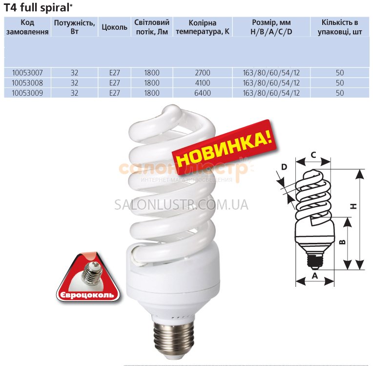 Енергозберігаюча лампа серії T4 Full Spiral виробництва компанії DELUX. Висота: 163мм; Діаметр: 60мм; Тип патрона: E27; Потужність: 32W; Колір: теплий(2700K),нейтральний(4100K),холодний(6400K).