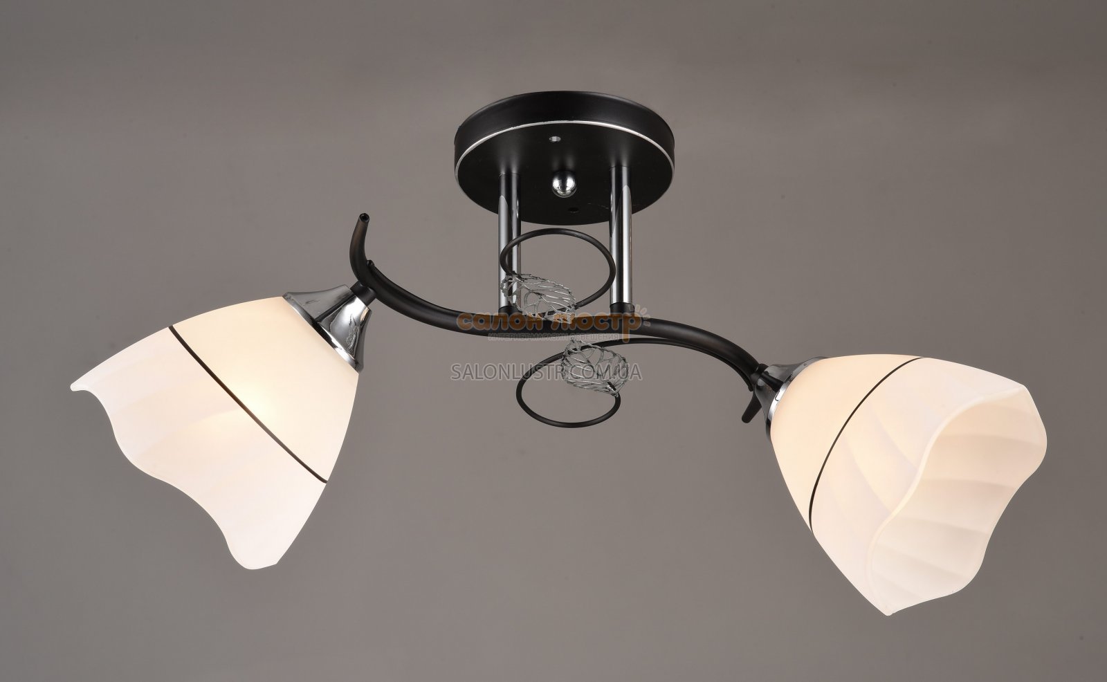 Люстра стельова виробництва компанії Sirius; Матеріал: метал, скло; Колір підстави: чорний+хром; Колір плафона: білий з малюнком; Висота: 24 см; ширина: 44 см; лампи: 2 х Е27 х 60 Вт.