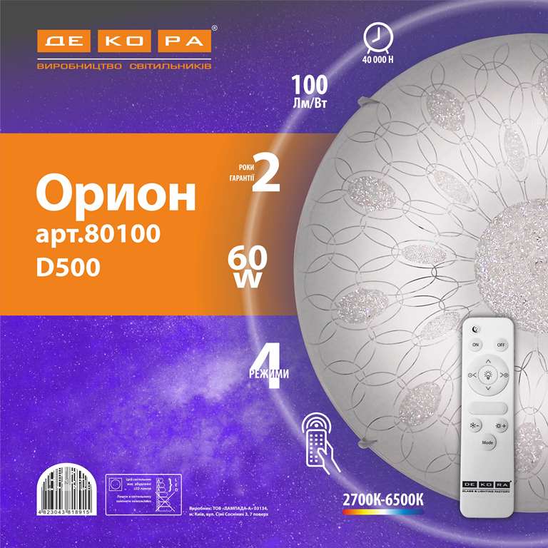 Світильник світлодіодний стельовий^-стельовий-настінно-стельовий Оріон 60Вт LED з пультом