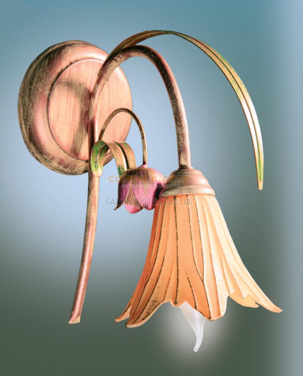 Світильник настінний (бра) виконаний у стилі флористика виробництва Україна; Матеріал: метал, скло; Колір основи: очерет (бежевий+золото+зелений); Колір плафонів: помаранчевий+золото; Висота: 27 см; ширина: 15 см; лампи: 1 х Е-14 х 60 Вт.
