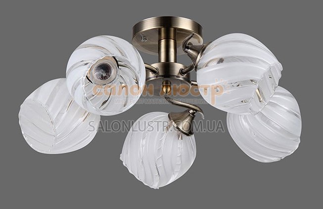Люстра стельова виробництва компанії Sirius; Матеріал: метал, скло; Колір підстави: бронза; Колір плафона: білий матовий із прозорим малюнком; Висота: 20 см; діаметр: 45 см; лампи: 5 х Е27 х 60 Вт.