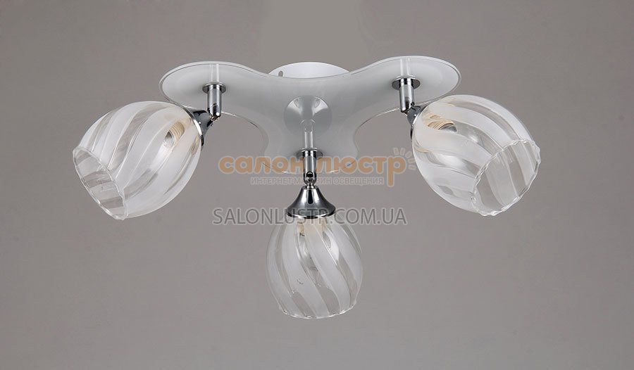 Люстра стельова виробництва компанії Sirius; Матеріал: метал, скло; Колір підстави: білий+хром; Колір плафона: білий матовий із прозорим малюнком; Діаметр: 50 см; висота: 20 см; лампи: 3 х Е27 х 60 Вт.