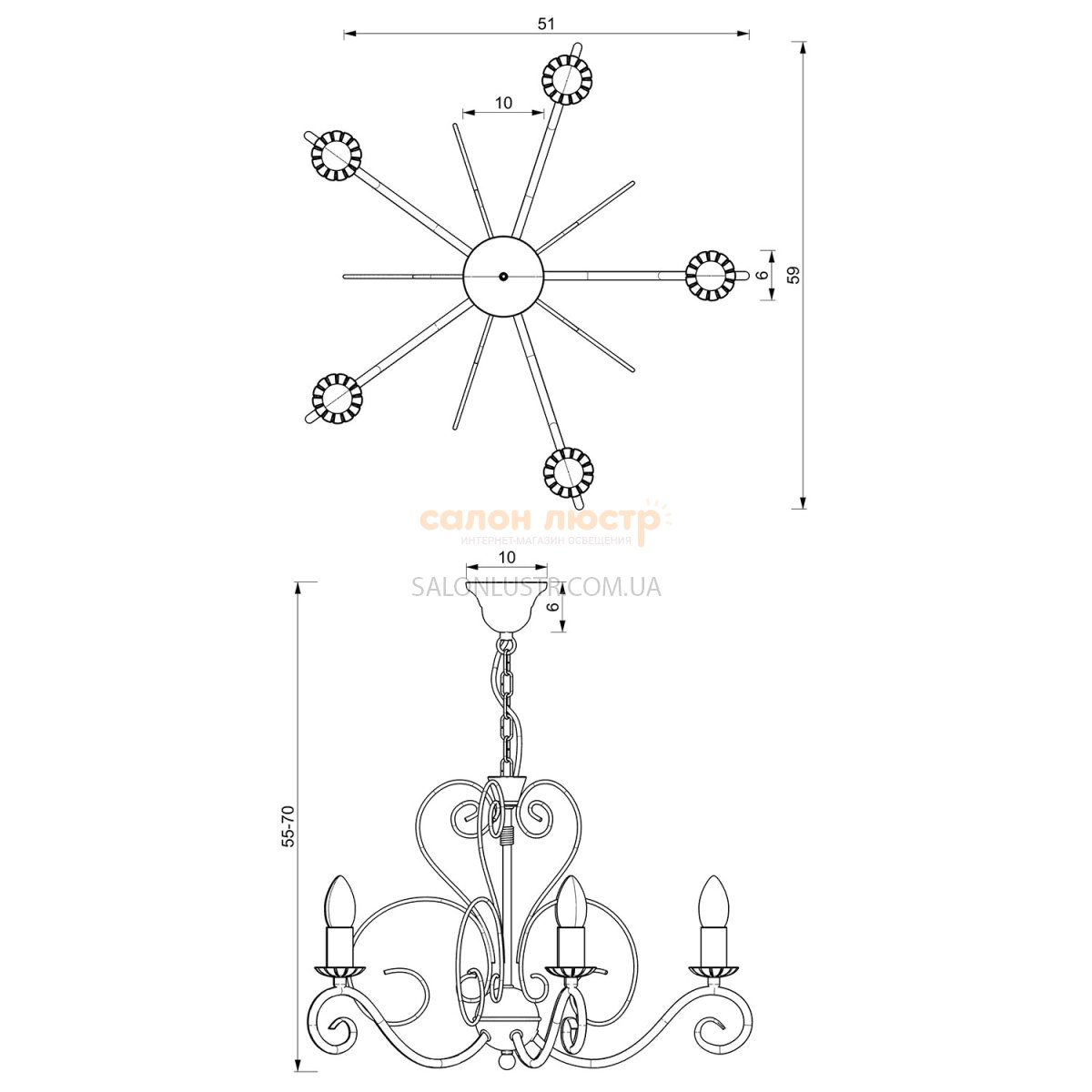 Висота: 55-70 см; ширина: 62 см ; лампа: 5 х Е-14 х 60 Вт.