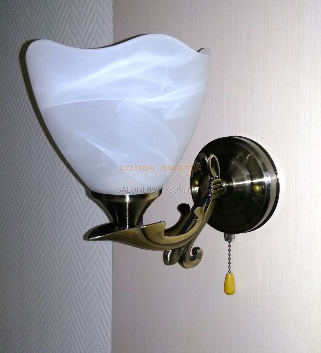 Бра класичне виробництва компанії Sirius; Матеріал: метал, стекло; Колір підстави: бронза; Колір плафона: білий матовий; Висота: 18 см; ширина: 14 см; відступ: 23 см; лампи: 1 х Е-27 х 40 Вт.