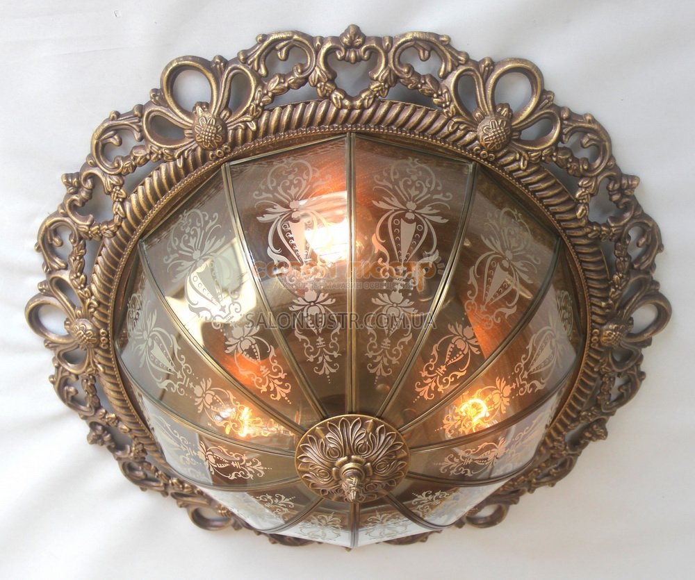 Світильник стельовий виробництва компанії WUNDERLICHT (Німеччина); Матеріали: метал, скло; Колір основи: бронза; Колір плафона: прозорий з малюнком; Висота: 22 см; діаметр: 50 см; лампи: 3 х Е-27 х 60 Вт.