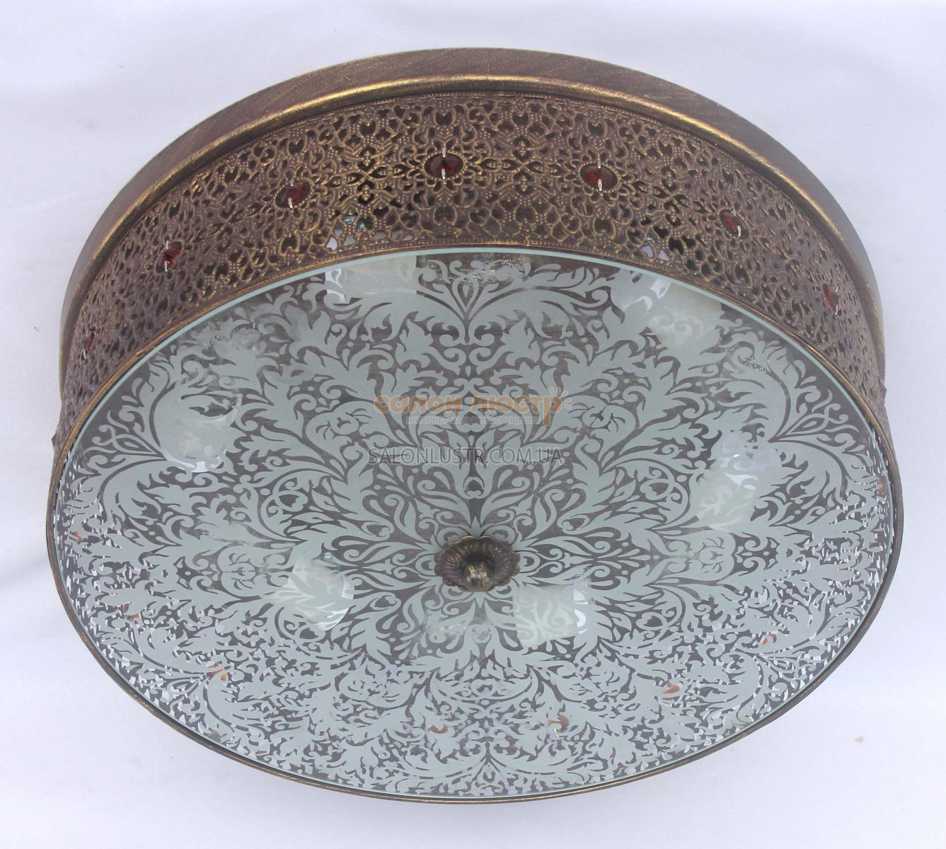 Світильник стельовий виробництва компанії WUNDERLICHT (Німеччина); Матеріали: метал, скло; Колір підстави: бронза із золотою патиною; Колір плафона: прозорий з малюнком; Висота: 16 см; діаметр: 50 см; лампи: 6 х Е-27 х 60 Вт.