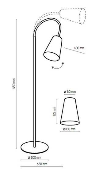 Висота: 145 см; ширина: 65 см; лампи: 1 х Е27 х 60 Вт;